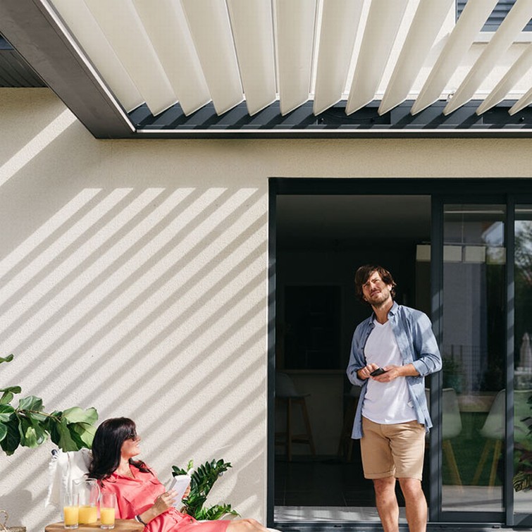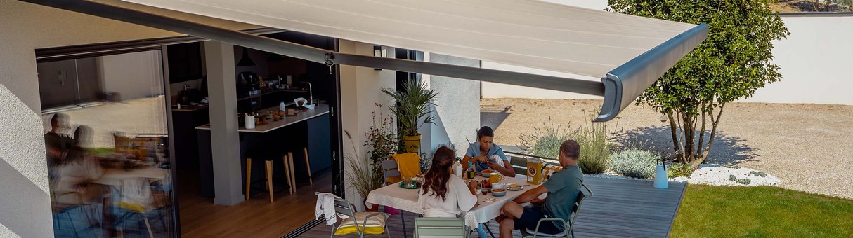 Med Somfys innovativa motorer och smarta styrsystem kan du enkelt anpassa din utomhusmarkis efter väder, dina preferenser och din dagliga rutin.