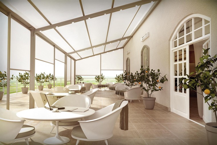 Verandor – kännetecknas av fasta stolpar med tvärbalkar och ofta glasväggar (ibland rörliga). Verandor monteras som prefabricerade konstruktioner mot fasaden. På taket och sidorna kan du montera solskydd som löper längs skenor, likt screenmarkiser. Läs mer >