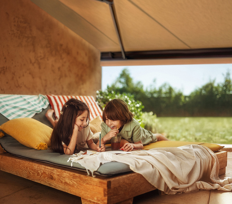 Med Somfys uppkopplade lösningar får du ut det mesta av dina utomhusytor – helt utan ansträngning. Din markis anpassar sig efter vädret, skyddar dina barn från solen och dras in vid oväder. För sommarkvällar kan du skapa scenarier i TaHoma-appen för att styra pergola, belysning och musik – för perfekta middagar med vänner.