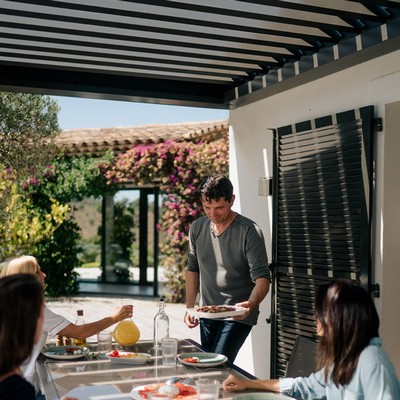På kvällen skapar du en mysig atmosfär genom att automatiskt sänka din markis. Din terrass blir en förlängning av den trevliga stämningen inomhus. Och när det blir kallare eller lite för mörkt har Somfy en smart lösning.