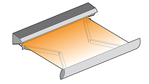 Markisens duk faller in under kassettens överdel när markisen fälls in. Även armarna befinner sig då utanför kassetten. Kassetten är (delvis) öppen nedtill.