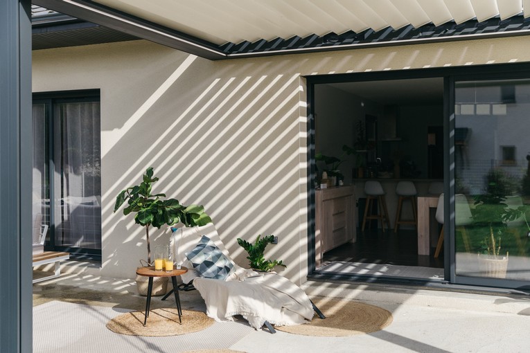 En veranda är vanligtvis en överbyggd, delvis innesluten struktur som är ansluten till huset, ofta med glasväggar. En pergola är oftare en öppnare struktur som bara har ett tak. Båda kan utrustas med smarta Somfy-lösningar för solskydd och belysning för maximal komfort.